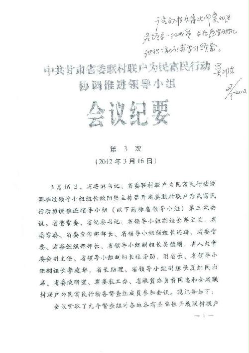 中共甘肃省委联村联户为民富民行动协调推进领导小组会议纪要